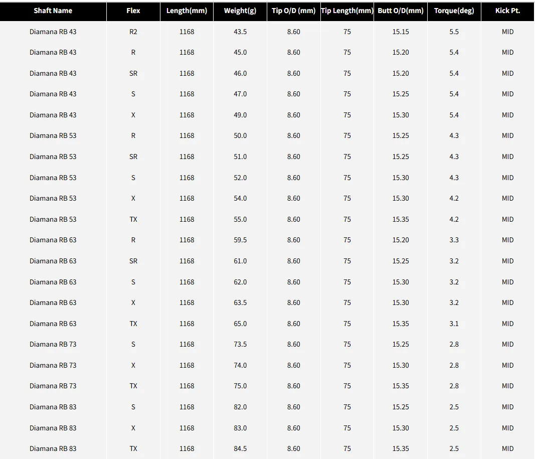 Diamana™ RB系列是三菱化學推出的第六代第三款紅色系高爾夫球桿桿身。該系列降低了桿身前端的剛性,實現「高彈道」,並搭載「New Tip Technology」,透過最佳的扭轉回復達到「適當的旋轉量」,滿足球手「高且遠」的需求。