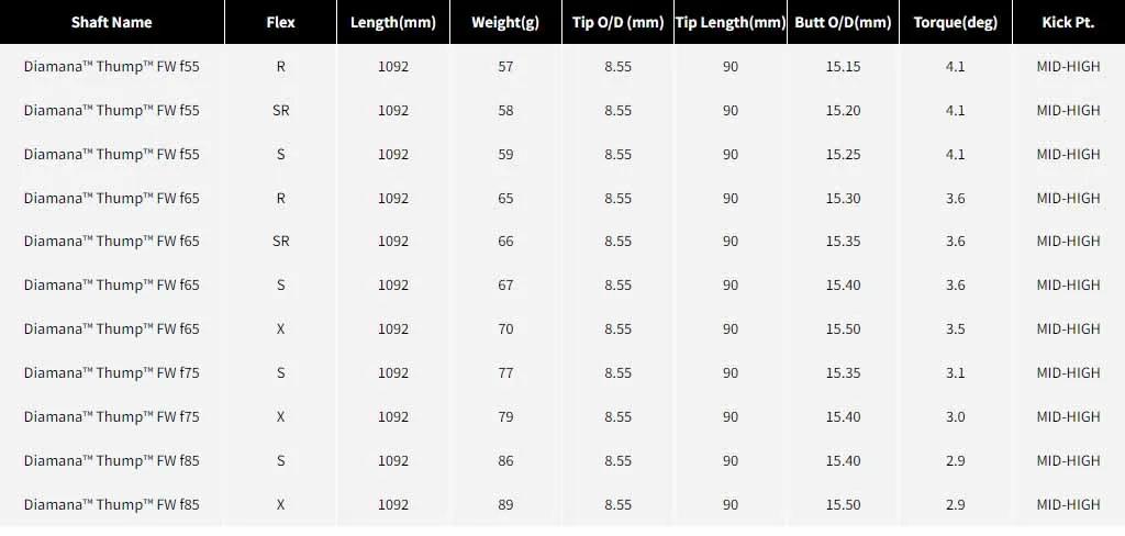 Diamana™ Thump FW Series 是針對擴展了Diamana™ Thump™ FW/Hybrid/Iron的規格,並進行了全新的改款。