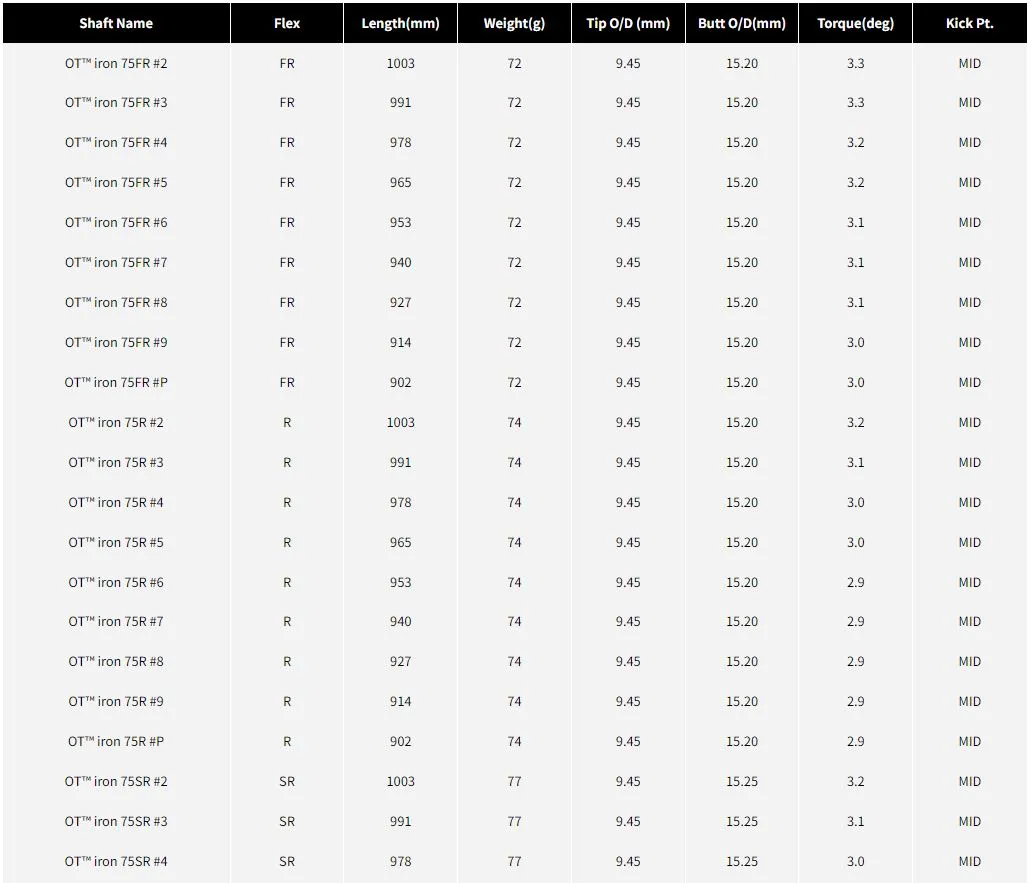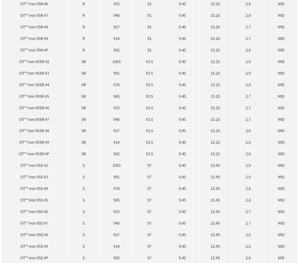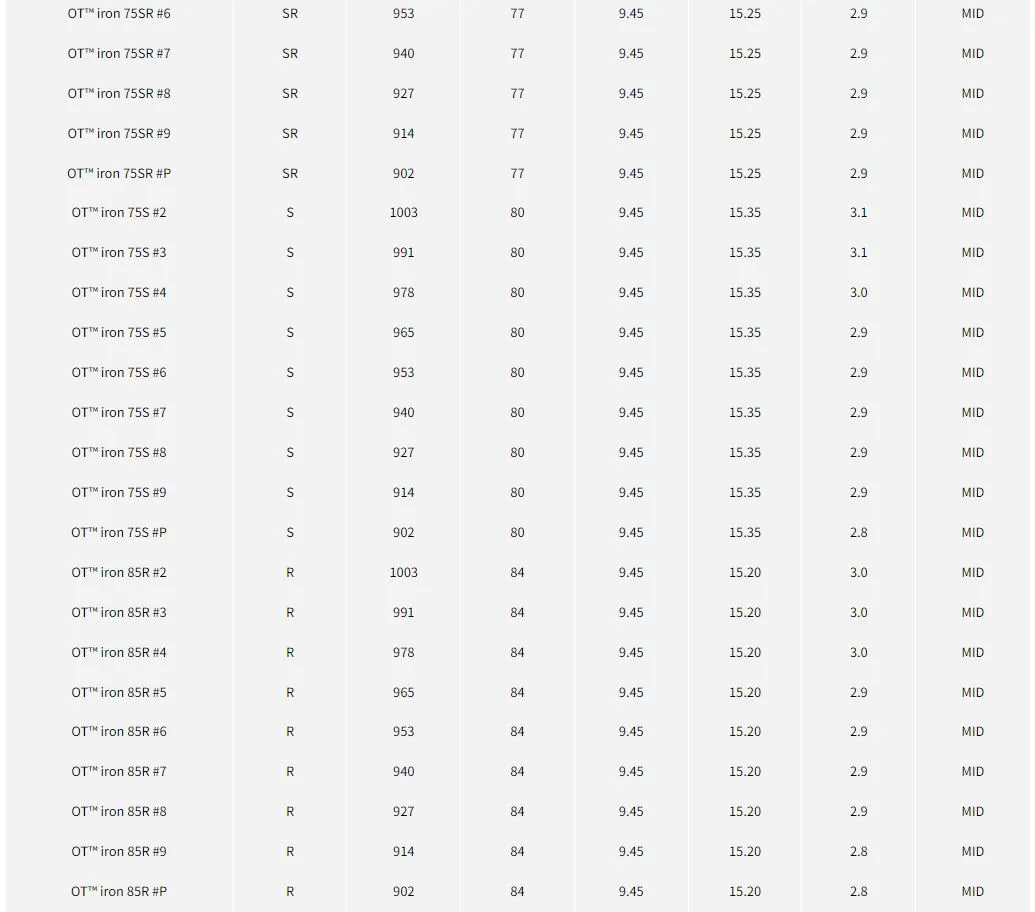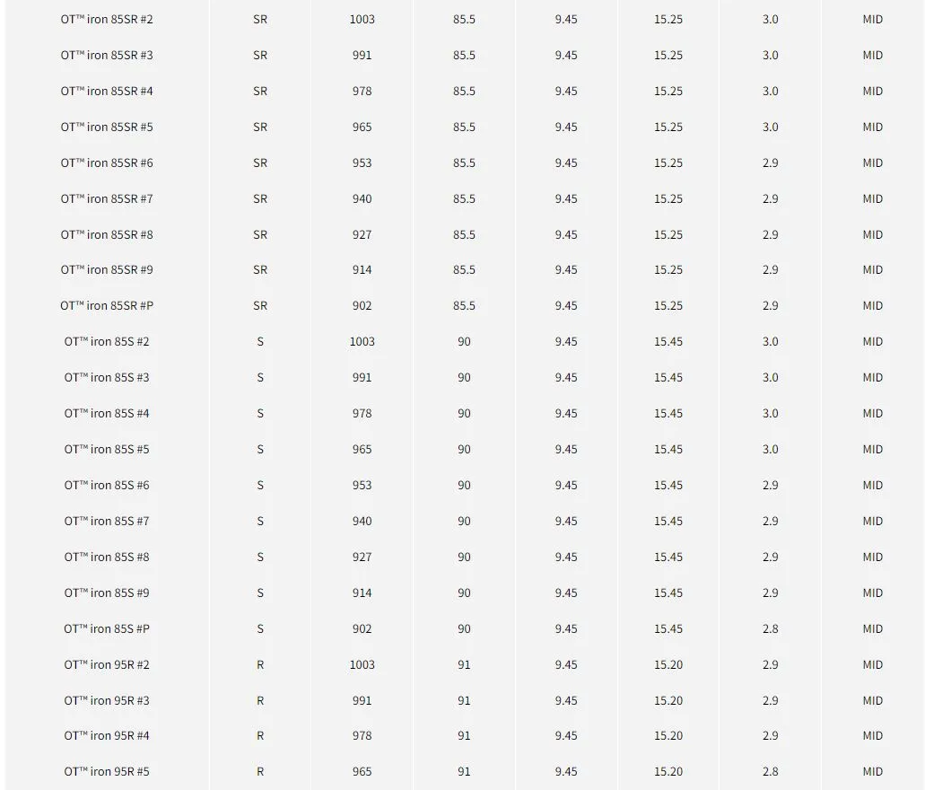 “OT™ Iron Series 使用創新的「OnTarget」鐵桿桿身,可實現高彈道並減少撞擊點的變化, 允許從正上方瞄準精確點進行激進的射擊。 現已更新為特定於計數的設計,可以更輕鬆地創建平滑的重量流動。 從長鐵桿到挖起桿,現在可以進行更精確的設定。”